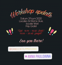 Aankomende maandagavond sluiten we het dansseizoen af met allerlei workshops. Je kunt je opgeven voor Hiphop, Afro, Modern en High Heels. Tijden volgen nog.