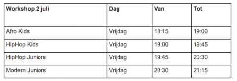 Aankomende vrijdagavond sluiten we het dansseizoen af met allerlei workshops. Je kunt je opgeven voor Afro, HipHop en Modern. De tijden staan in het bovenstaande tabel. Iedereen is welkom. Deelname is gratis. Wel is nodig om je op te geven omdat er limiet zit aan het aantal deelnemers. (vol=vol)